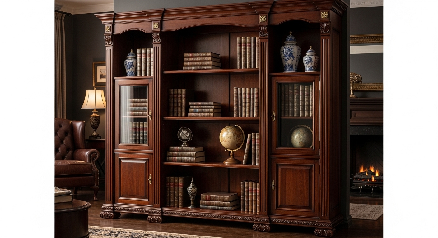 Large bookshelves dominate walls, ideal for avid readers with hundreds of books. Common in home libraries.