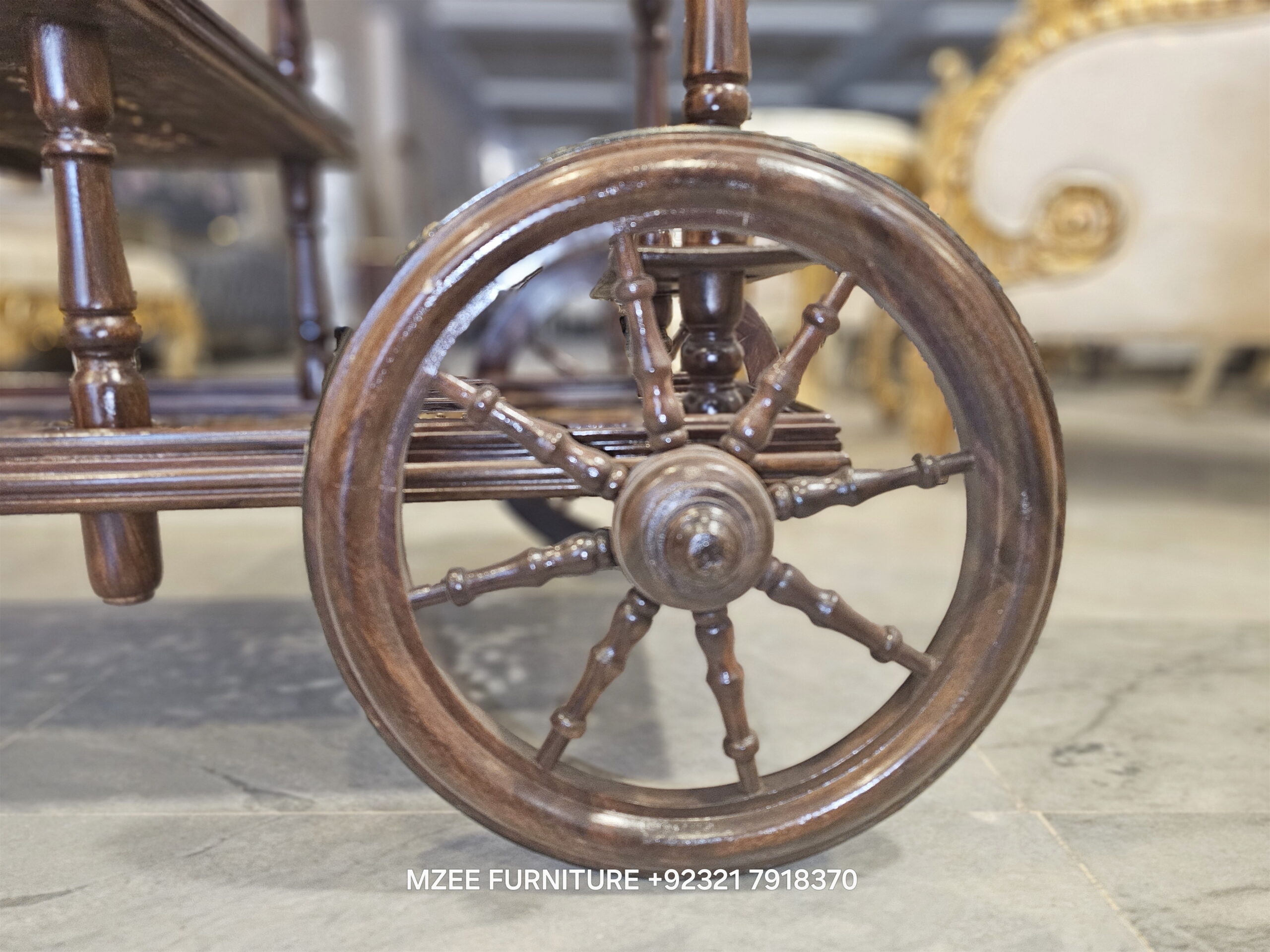 Our Bar Cart is constructed from top-grade Sheesham wood, renowned for its strength, durability, and beautiful natural grain. The wood is carefully kiln-dried to reduce moisture content, preventing cracks and warping over time. Every joint features solid mortise-and-tenon craftsmanship, ensuring maximum stability, while hidden fasteners maintain a clean look. The high-quality polish highlights the wood’s rich hues while providing scratch and water resistance. This Bar Cart also incorporates durable metal hardware, including handles and caster supports, for long-lasting mobility. LSI keywords like modern wooden furniture, handcrafted wood design, luxury interior furniture, solid wood sofa, sheesham wood sofa naturally complement the section, emphasizing artisanal quality. Foam pads are applied on edges where glassware rests to prevent scratches, while the surface is treated to resist minor spills. This blend of traditional woodworking and contemporary finishing ensures the bar cart meets the expectations of luxury furniture enthusiasts in Pakistan and abroad.