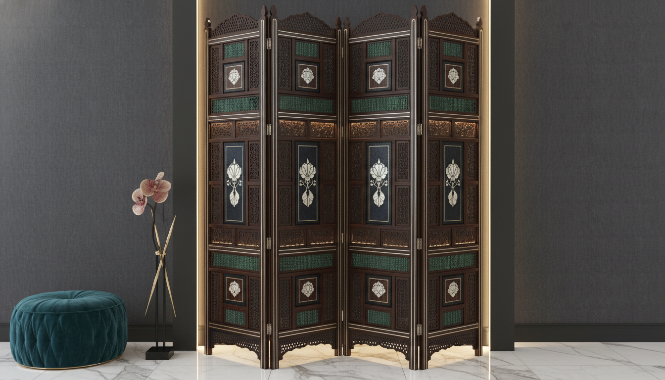 Hand-carved 4-Panel Room Divider – Often made of mango wood and MDF, these carved screens offer detailed pattern work, sturdy construction, and fold-away convenience.